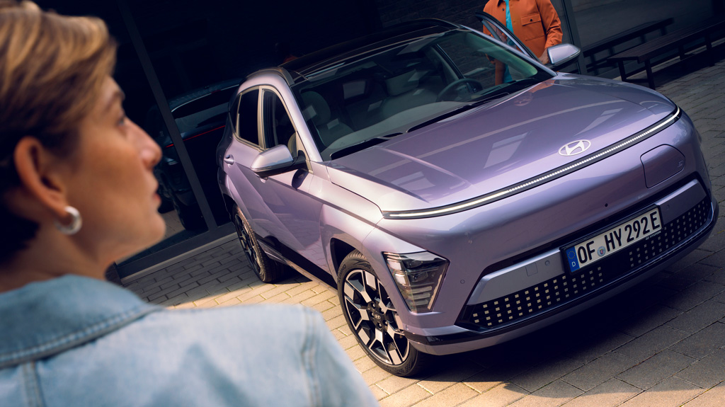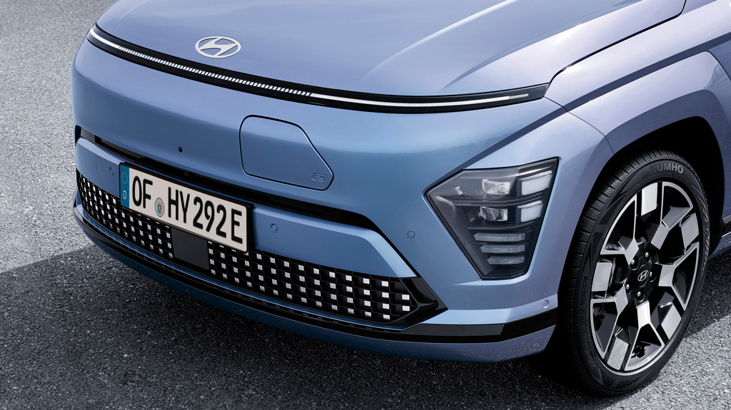 KONA Electric futūristisko stilu akcentē priekšpuses elegantais, unikālais dizains un aerodinamiskās plūdlīniju formas.
