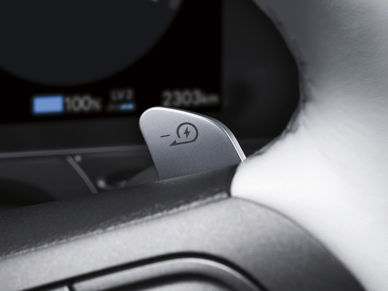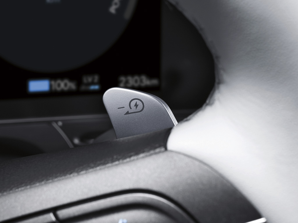Kontrolējiet, cik daudz enerģijas sistēma reģenerē un uzkrāj akumulatorā, ar pārnesumu pārslēgšanas lāpstiņām pie stūres. Jo augstāks ir šis līmenis, jo vairāk automobilis samazina ātrumu, noņemot kāju no akseleratora pedāļa.
