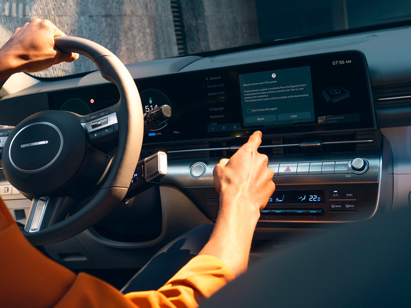 KONA Electric sniedz jauna līmeņa savienojamību ar Hyundai jaunākās paaudzes infoizklaides sistēmu ccNC (Connected Car Navigation Cockpit), kas piedāvā uzlabotu grafiku un pilnībā saskaņotus displejus.